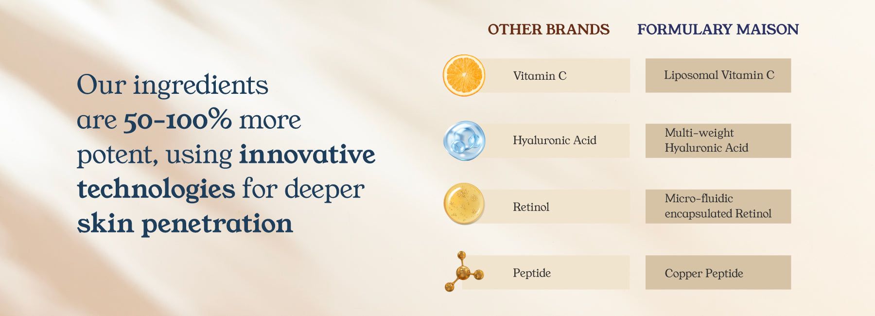 - Latest innovations in delivery science (encapsulation, liposomal etc) which result in higher absorption and deeper skin penetration.